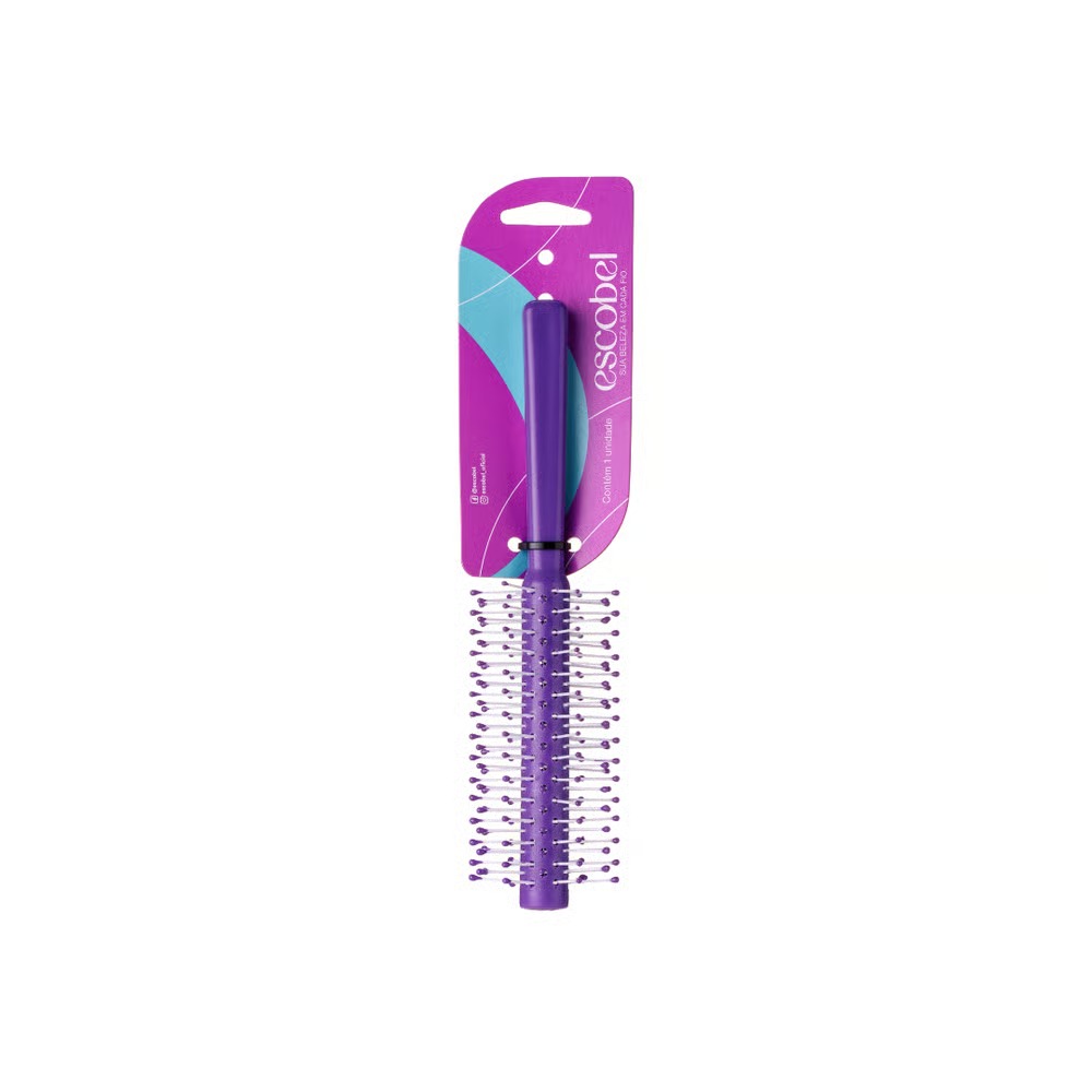 Escova de cabelo Escobel Nice 601 é um modelo redondo, de uso diário, indicado para pentear, desembaraçar e modelar os fios. Ela possui cerdas flexíveis e pinos com pontas protetoras, proporcionando uma massagem suave no couro cabeludo. É uma escova versátil, com características anti-frizz, e é enviada em cores sortidas