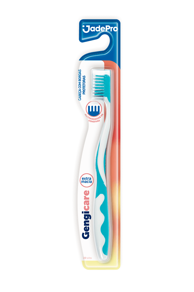 Escova Dental Gengicare - JadePro possui cerdas polidas e estramacias. Com cabo emborrachado, design anatômico e cabeça com bordas protetoras. Possui massageador de gengivas.