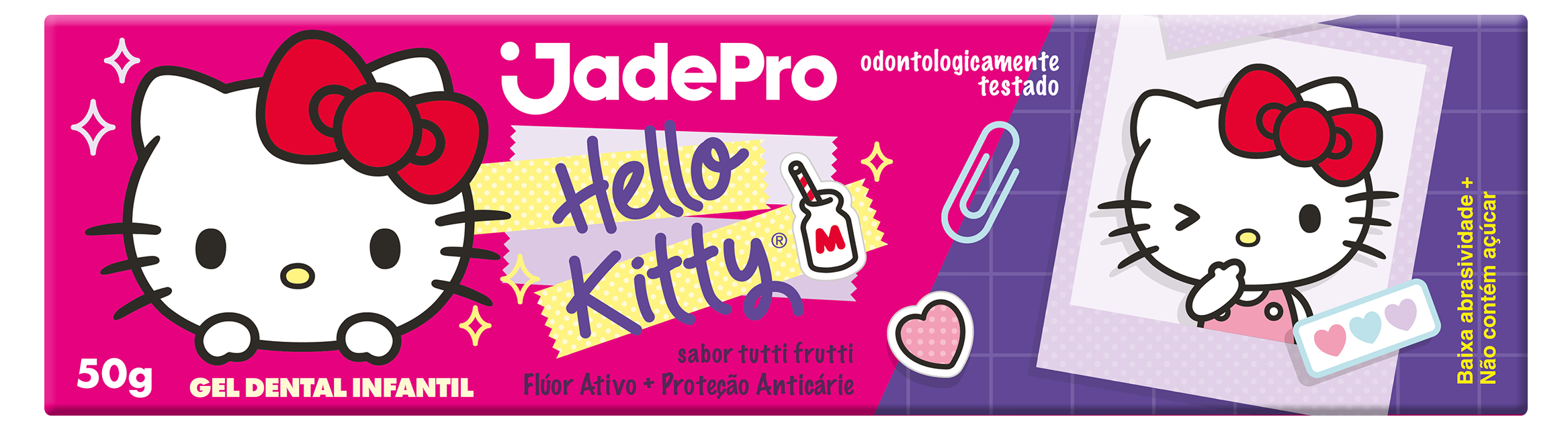 O Gel Dental JadePro Hello Kitty foi elaborado com Flúor Ativo, que previne cáries de modo eficaz e seguro e preserva o esmalte dos dentes devido à sua baixa abrasividade, Seu aspecto gel e o agradável sabor Tutti Frutti ajudam a desenvolver o interesse pela escovação.