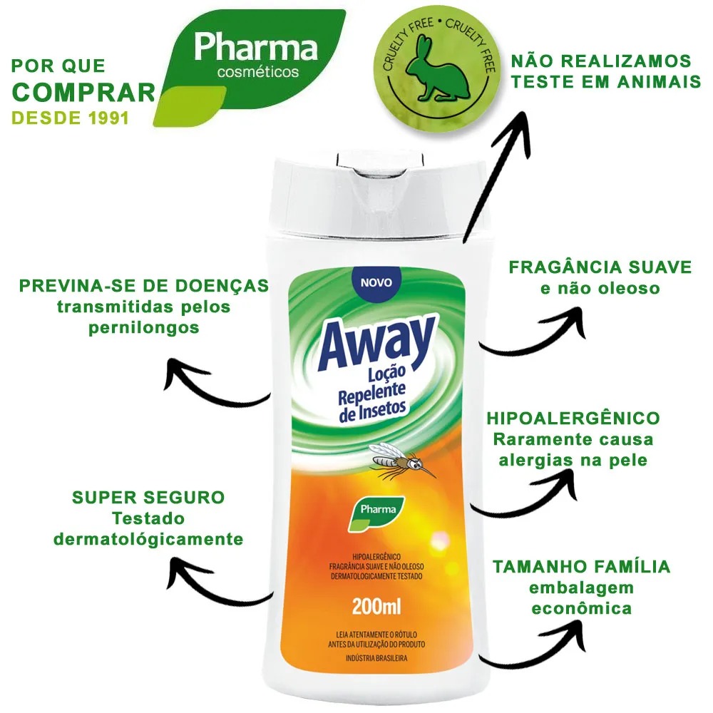 A Loção/Spray Away Repelente de Isetos ajuda a proteger a pele contra picadas de insetos, trazendo uma sensação de liberdade, de tal forma que se possa curtir a vida ao ar livre. Contém fragrância suave e ingredientes hidratantes que deixam sua pele macia. Sua formulação utiliza o DEET , que é um composto orgânico repelente de insetos e possui tecnologia comprovada (através de Testes de Eficácia) para afastar o Aedes aegypti (mosquito transmissor da Dengue, Febre Amarela e Chicungunya), o Anopheles albimanus (mosquito transmissor da Malária) e o Culex quinquefasciatus (mosquito transmissorda Filariose). • Não permitido o uso deste produto em crianças menores de 2 anos • Aplicar até 3 vezes ao dia